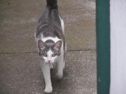 Smokey joined our family as a result of Dawn taking in a ferral cat who subsequently had kittens. I am a sucker for kittens so I was happy to take Smokey and the kids were looking forward to having a kitten to play with (a cat who didn't bite or scratch them as Misty sometimes did for no apparent reason). Smokey was quite independent from the first and stood her ground with the dog, Cody. She is the opposite of Misty in that she loves the outdoors and spends very little time inside - mostly overnight where she likes to cuddle up to the boys in bed. She is quite a hunter and used to bring us little 'presents' until she realized that I would catch them (if still alive and throw them out), or throw them out. Now she brings the neighbors presents as they haven't worked out how to stop her from doing so. We enjoy Smokey a lot. UPDATE: Smokey suprised us a couple of years ago with one kitten (thankfully) after which I got both her and her kitten spayed. The kitten is just as entertaining as Smokey is - also a prolific hunter. She used to scratch a lot as a kitten and we were watching the Simpsons marathon at the time so we called her 'Scratchy' of 'Itchy and Scratchy fame'. Even though she looks like Misty is her mother, she is Smokey's kitten. Go figure.